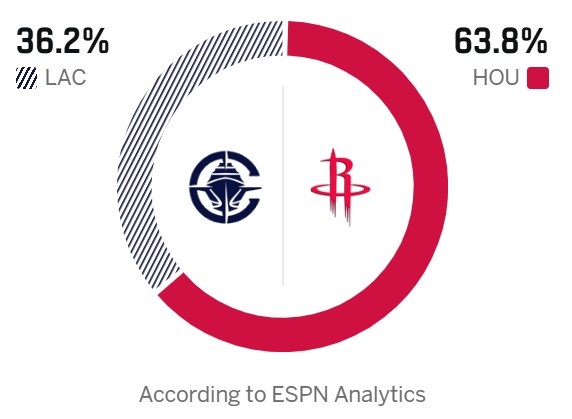 今天,ESPN預測本場勝率,快船36.2%,火箭63.8%。