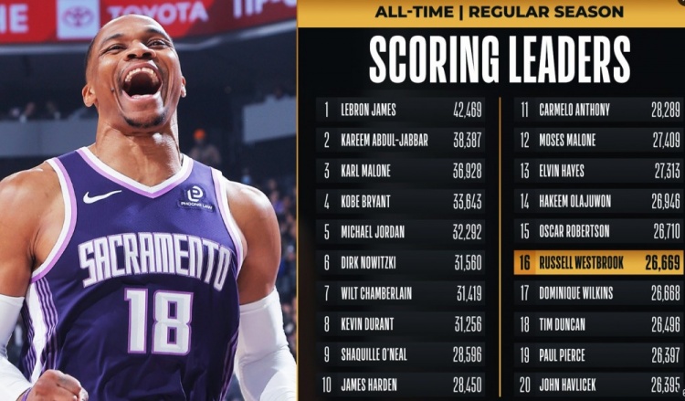 得分:威少總得分數(shù)超越多米尼克·威爾金斯,上升至NBA歷史第16位。