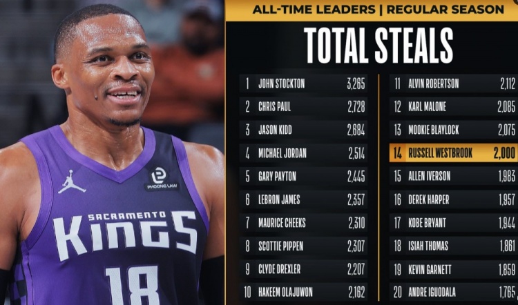 搶斷:威少總搶斷數(shù)突破2000次,NBA歷史第14人;