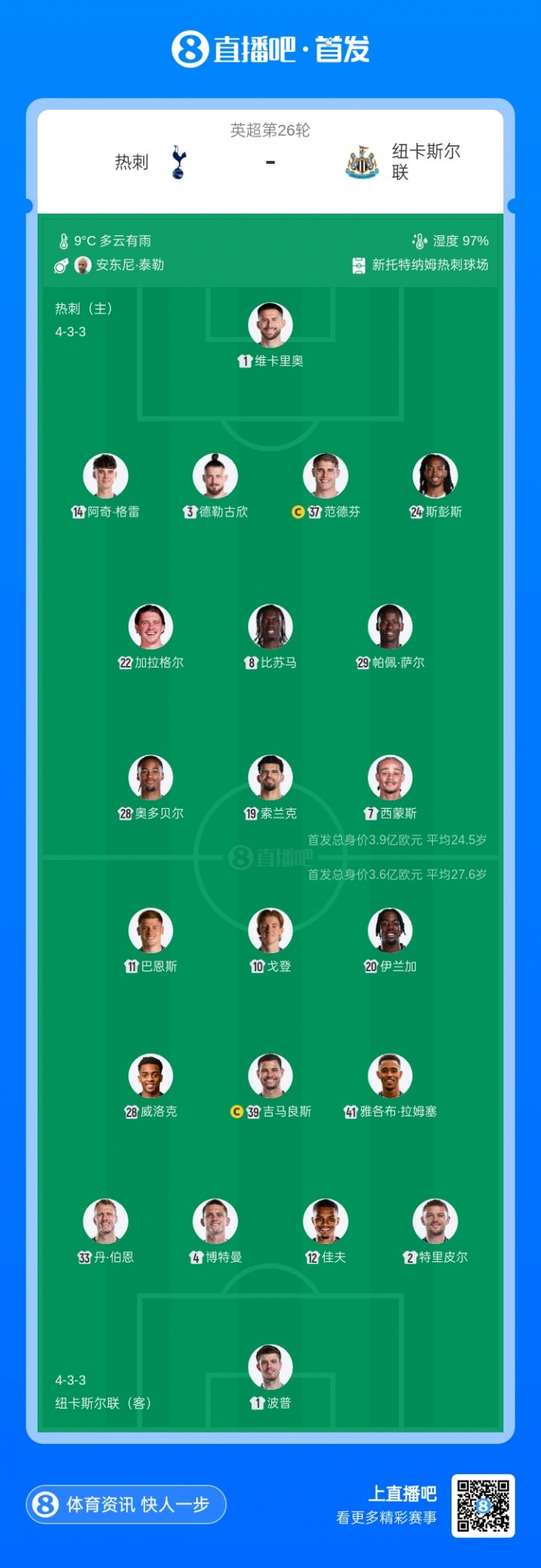 2月11日訊 北京時間2月11日3:30,英超第26輪,熱刺vs紐卡。賽前雙方公布了本場比賽的首發(fā)名單。