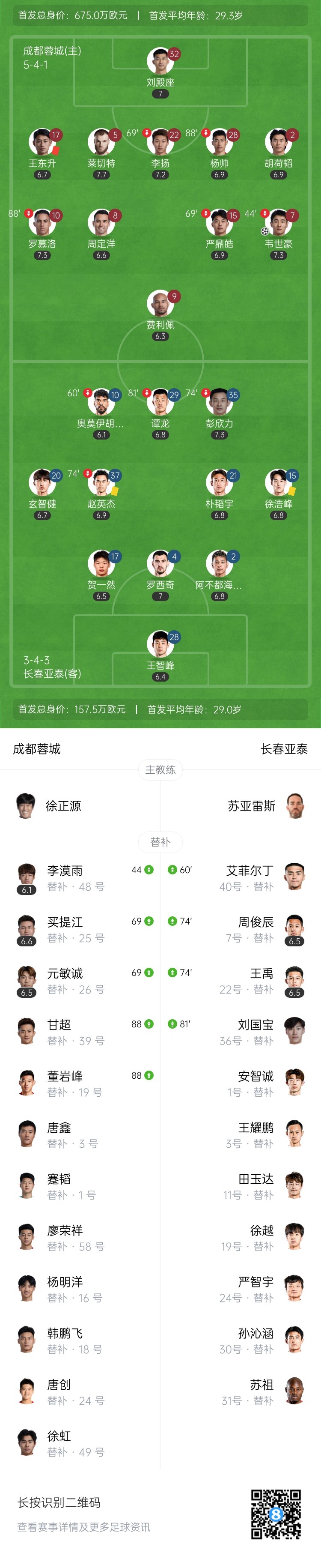 下半場補(bǔ)時(shí)6分鐘。最終全場比賽結(jié)束,成都蓉城1-0長春亞泰。